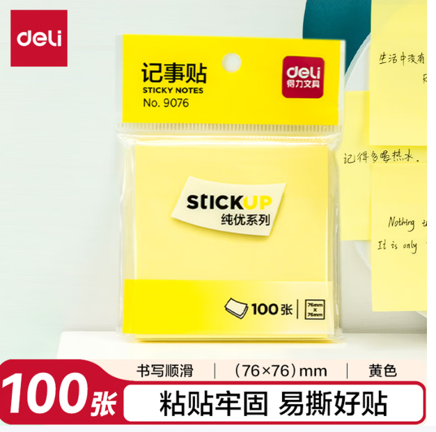 得力/deli 9076 记事贴 100张便利贴76*76mm备忘便签易撕好贴牢固优事贴方形记事贴留言本